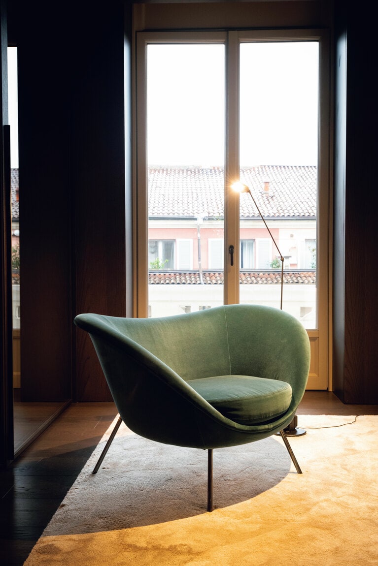 ジオ・ポンティが1950年代にデザインしたアームチェア「D.154.2」 1,082,400円(「パラッツォ・モルテーニ東京」での価格)。ヘリテージコレクションとして復刻された。 内部庭園を囲むように作られた建物。最上階の2フロアはゲストとの交流の場。テラスでイベントが行われることもある。 マーケティング&コミュニケーション部門を率いる、ジュリア・モルテーニ氏。オーナーファミリーの3代目。彼女が座っているソファはヴィンセント・ヴァン・ドゥイセンによる「Augusto」。 システム収納は同社の空間提案の核である。包み込むような形状のアームチェアは深澤直人氏によるデザインの「Cinnamon」。 各エレベーター前には有名建築家による過去の名作を展示。書斎机はジオ・ポンティのアーカイブから復刻した「D.847.1」。エリザ・オッシノによるキュレーションでアート作品も飾られている。 ガムフラテージのデザインによるベッド「Tibeau」。 ミラノの邸宅の典型的なレイアウトで、通りに面した入り口から内部庭園を通ってアクセスする。