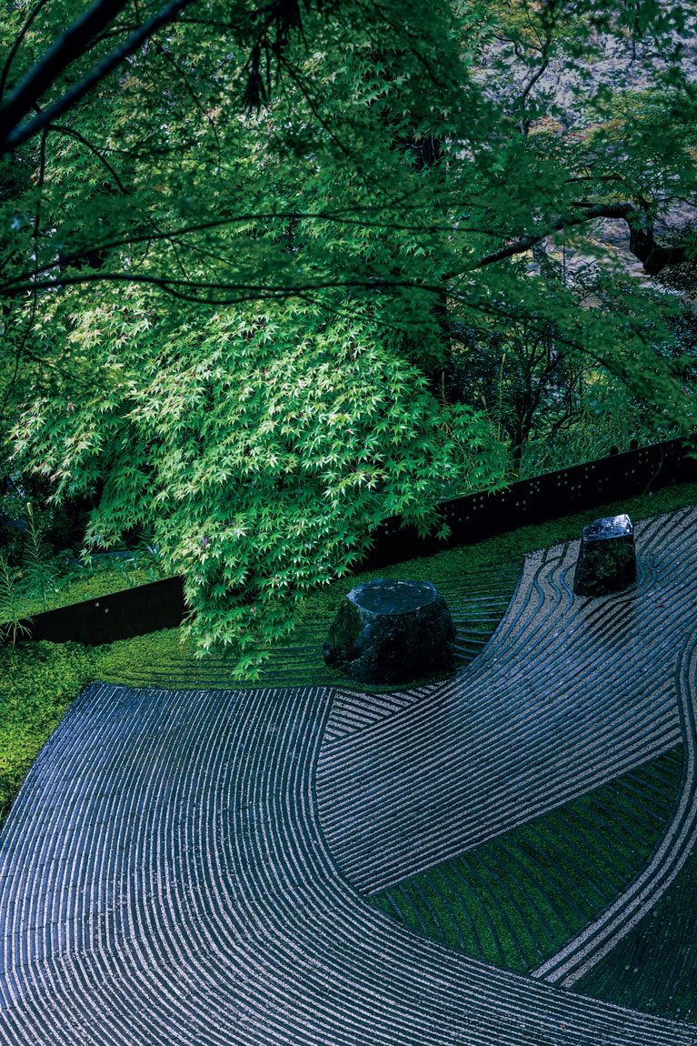 嵐山の自然と一体化した「奥の庭」。樹齢400年のオオモミジの枝ぶりと枯山水の砂紋が美しい。 “洗い”の技法が施された客室“月橋”。窓の外には大堰川の清流と嵐山の自然が広がる。 重厚感の漂う建築は約100年前のもの。 冬の献立「真味自在」の主菜は、熊挽肉を巻いた鰻の丹波産赤ワインソース風味と、パリッと焼き上げた鴨肉の盛り合わせ。鴨は皮目に細かな包丁目を入れてパウダー状にした八ッ橋をすり込んでいるため、ほのかな甘い香りが楽しめる。付け合わせは栗の甘酢漬け。 寝室の壁紙には、客室ごとに異なる京唐紙が使用されている。 「星のや京都」の前身は明治創業の旅館。当時植えられた木々が大切に残されている。 燻し瓦と白砂を砂紋に見立てた枯山水の庭。座観式ではなく実際に歩けるという、前衛的な枯山水。借景の大堰川と相まった景色も魅力。何もしないと自然に苔が生えるが、手入れで白砂を維持しつつ、一部の苔を残している。 本から多くの学びを得るという、加藤氏。 視点場とは、景観を眺めるための場所のこと。「奥の庭」の視点場は、樹齢約400年のオオモミジの木の下に置かれた景石。石に座ると、小倉山が借景として見える。 路地庭沿いの客室の前に敷かれた「延段」は、短冊状に石を敷き詰めたもの。職人がひとつずつ手がけた延段の意匠は客室ごとに異なり、路地庭に風流な趣を漂わせる。石材は全国から集められた。 客室やライブラリーラウンジが連なる「路地庭」は、茶庭の露地の精神を取り入れた庭。昔は切り詰めていた枝を伸ばすことで、紅葉のトンネルが実現した。苔むした路地庭で手入れする姿も“人文風景”として絵になる。 流れ落ちる滝の手前に木を植え、滝の全体像を直接見せないようにする手法。木を透かして滝を見せることで奥ゆかしさを演出し、見る者の想像力を搔き立てる効果がある。 戦前戦後に活躍した庭師・小島佐一が70年以上前に手がけた意匠を残し、嵐峡の自然に調和するように革新的なデザインを施した庭。滝は以前の庭の遺構から復元したもので、滝の前にはモミジの木で飛泉障りを施している。 一、国々の名所を思いめぐらして、その面白い所々を自分の考えに取り込んで、 大体の姿をその所々になぞらえ、素直に立てるべきである。 大河内山荘庭園。 無鄰菴。 南禅寺。 星のや軽井沢。 星のやバリ。