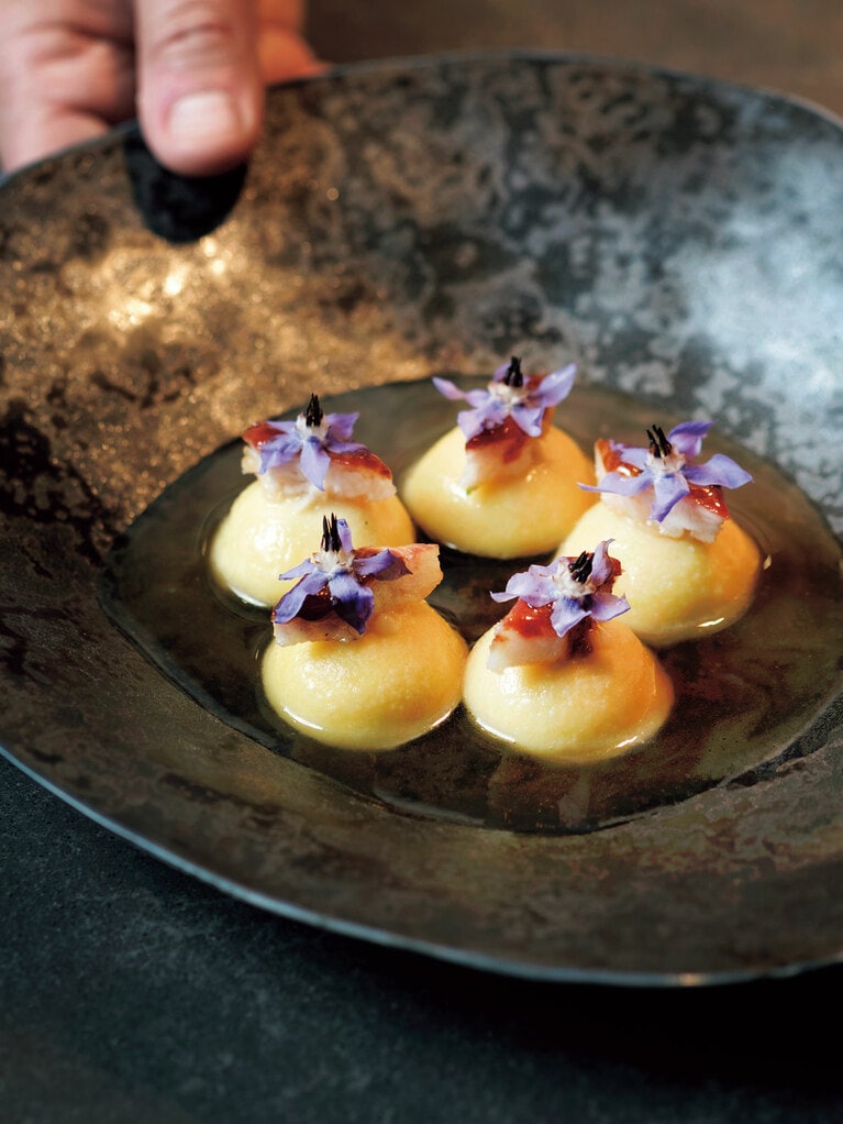 ロースト度合いが異なるピーナッツを餡にして詰めたラビオリにスモークした鰻、柑橘と鶏のブロスを注ぐ。ピーナッツの芳醇な甘みに鰻のとろける脂と香ばしさが調和する(50ユーロ)。コースは一人前220ユーロのおまかせのみ。アラカルトも注文可。白トリュフの時期には特別コースも。 カンパリでマリネしたビーツにチョウザメとキャビアを合わせた薔薇を模したアミューズ。チョウザメの旨みと酸味のバランスに食欲がそそられる。 パンも毎日焼きたてを提供している。 プーリア出身の兄レモ(左)と弟マリオ(右)。寡黙な兄と明朗快活な弟は正反対だが、息の合った動きで美しく盛り付けられゆく皿に期待が高まる。 厨房を囲むように配置されたカウンター席。 エントランス。