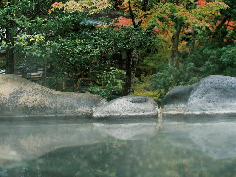 温泉は写真の、四季折々の自然と溶け込むような野天風呂の他、男女別の内湯、貸切風呂もあり。 12ある客室はすべてタイプが異なり、写真は一段下がった縁側から直に眺める庭の木々と、川のせせらぎに心から癒される「萩」。 修禅寺の門前に初代・浅羽弥九郎幸忠が開いた宿坊に端を発し生まれたあさば。600坪の池には旧大聖寺藩主、前田利鬯子爵より富岡八幡宮へ寄進された能舞台「月桂殿」が。 池のほとりに浮かぶ小舟。その奥には宿泊者が自由にくつろげるサロンがある。 これぞ究極のミニマリズムを感じるエントランス。 野天風呂には、あたたかいタオルも。 部屋の設えは、掛け軸と花のみ。 藍染めが美しいのれんの柄は、あさばをまさに象徴した潔く美しい意匠。