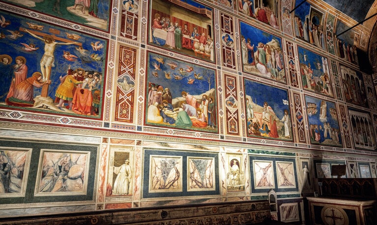 スクロヴェーニ礼拝堂の両側の壁面と後陣、天井を望む。 中段左から《キリスト磔刑》の図や《死せるキリストへの哀歌》の図が並ぶ。一連の作品は、市内の他7施設の14世紀に描かれたフレスコ画とともに世界遺産に登録されている。 《最後の晩餐》の図。「あなた方のうちの一人が私を裏切ろうとしている」とイエスが語るあの劇的な場面が描かれている。弟子たちの言葉や反応が手に取るように感じられる。 最下段には7つの美徳と大罪を表現した一連の寓話が描かれている。ジョットはその表現において最新技術の遠近法を先取りしており、だまし絵的な技法・効果が感じ取れる。 椅子にも彫刻が施され細部にわたり美が息づいている。 祭壇を臨む。礼拝堂内は作品群の保存上、内部の温度は年間を通して16度、湿度は60%に保たれている。 「スクロヴェーニ礼拝堂」