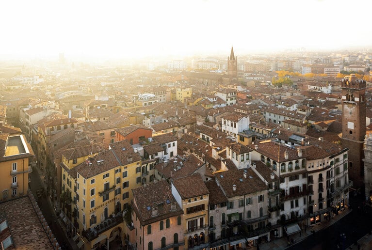 高さ84mの「ランベルティの塔」から街の南西側を俯瞰する。 街中に洗練されたブティックが立ち並ぶ。 夜のエルベ広場。中世の街がライトアップされると実に幻想的な光景になる。 ラジョーネ宮殿内にある近代美術館の入り口(階段)と「ランベルティの塔」を望む。