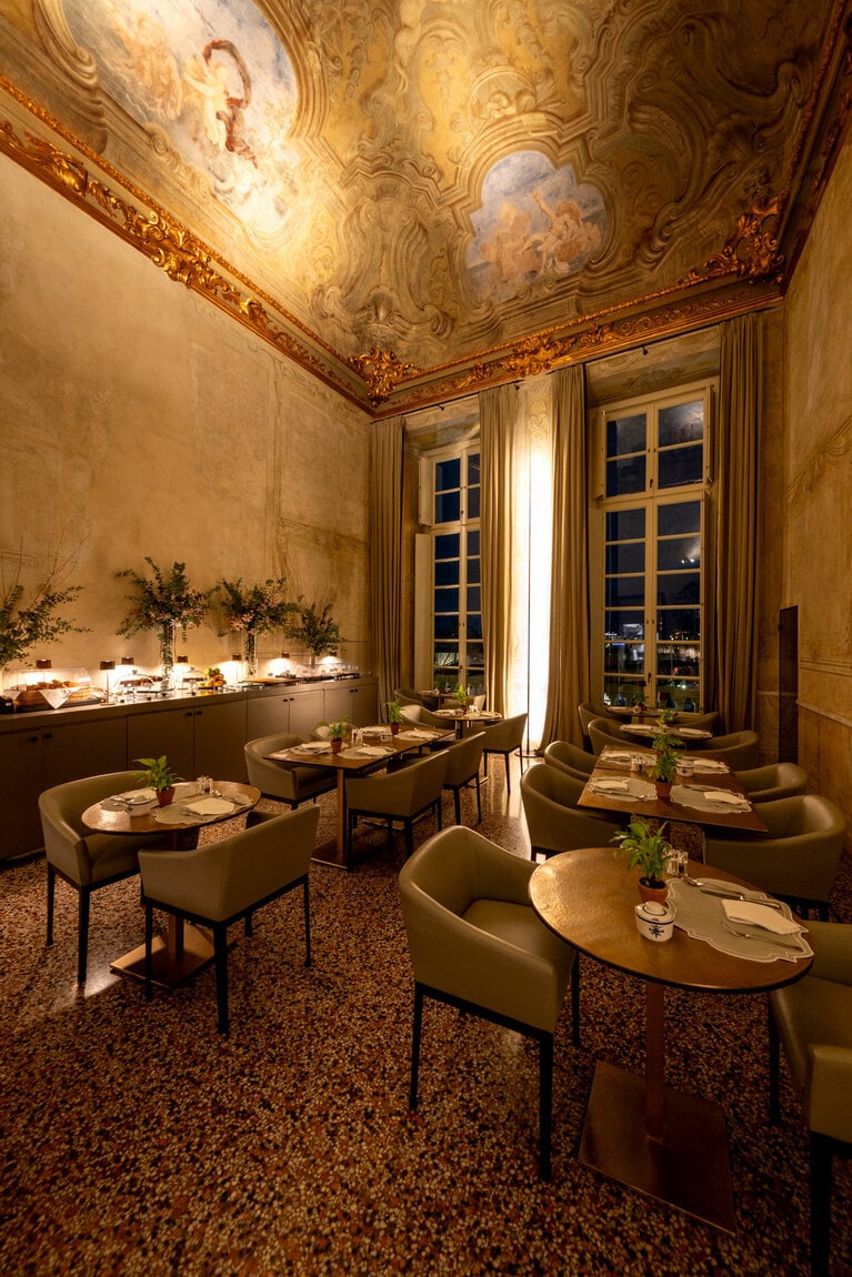 入り口をくぐるとすぐに圧倒的な偉容を誇るエントランスが。 18世紀後半のシノワズリーを彷彿とさせるスイートルーム“ロリエンテ”。天井を飾るトリトン像はステファノ・ドゥラッツォがガレー船団艦隊長だったことを象徴している。 トスカーナの名ワイナリー、カステッロ・ディ・ガビアーノが手がけたワインやドリンクを楽しめるインルームバーも。 バスルームの広々とした浴槽とシャワーで旅の疲れを癒やしたい。 17時から23時まで営業するラウンジバー「サローネ・ドゥラッツォ」。 フレスコ画を見上げ、港を望む眺めのいいダイニング。