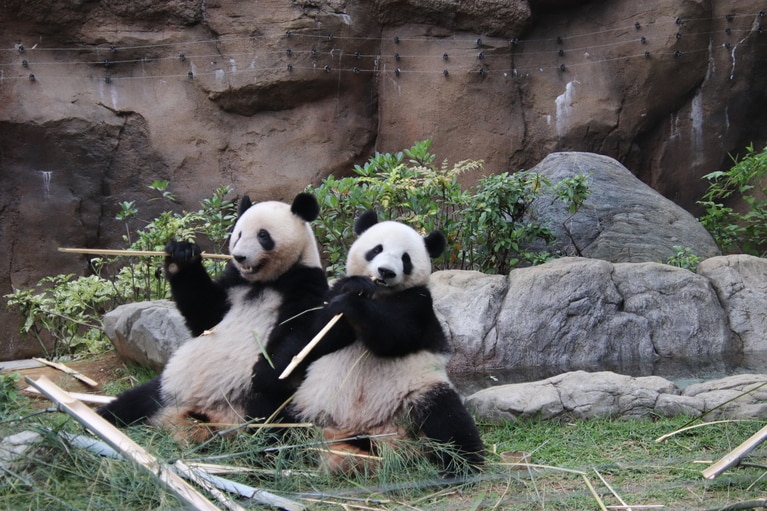 2023年6月22日撮影。左がレイレイ、右がシャオシャオ。(以下、写真はすべて神戸万知さんが撮影) 2022年3月25日撮影。著者にとっての初シャオレイ。左がシャオシャオ。 2022年3月29日撮影。親子で仲良く過ごす様子。 2022年3月29日撮影。双子で木登りをする様子。上がレイレイ。 2022年8月6日撮影。シャオシャオが寝ているあいだ、レイレイ(左)がシンシン(右)の横にちょこんと座っている。 2023年3月21日。木の高いところにいるレイレイと、心配そうなシャオシャオ。 シンシンから独り立ち後、後ろ歩きをするようになったレイレイ(右)。 2024年4月14日撮影。双子が一緒に過ごす最後の日。右がレイレイ。