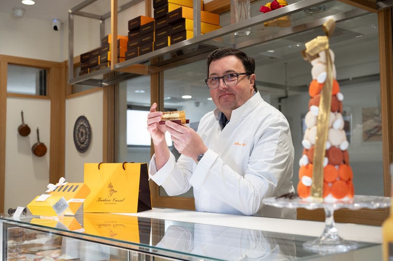 フレデリック・カッセル氏。ブランドのスペシャリテである「ミルフィーユ・ヴァニーユ」(1,188円)を手に。 フレデリック・カッセル氏。経堂のアトリエ店の前で。 フレデリック・カッセル氏。 フォンテーヌブロー本店。提供写真。 スタッフの白衣の胸元に刺繍されているのがブランドのシンボルマークの「エンジェル」。スタッフも、お客さんも。みんなが笑顔になるのがフレデリック・カッセル流だ。 これからもおいしいお菓子を届け続けるフレデリック・カッセル。背中にもエンジェルマークが。 2026年のフレデリック・カッセルの新作「シャ・ショコラ」(8個入り、4,212円) 8つのボンボンショコラは左上から時計回りで、マルシェ(オレンジとシナモンのガナッシュショコラ)、シャルドン農園(フランボワーズのガナッシュショコラ)、ショコラトリー(トンカとヴァヌアツ産カカオのガナッシュショコラ)、ブティック(洋梨とキャラメルのガナッシュショコラ)、フォンテーヌブロー宮殿(カシス・ヴィオレのガナッシュショコラ)、カッセル家の庭(ジャスミンティーのガナッシュショコラ)、メゾン(レモンとエルダーフラワーのガナッシュショコラ)、アトリエ(桜香る煎茶のガナッシュショコラ、ローズのヒント)。 バトン・ミルフィーユ。 バニラが香る「バトン・ミルフィーユ」(864円)は好評のため、アトリエ店で引き続き販売するのだそう。 カッセル氏と市川さん。 アトリエ店の外観。