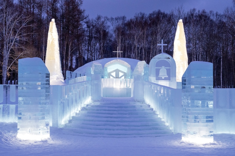冬の1ヵ月間だけ出現する「氷の教会」。 氷のゲートを抜け、氷の階段を上った先に氷の教会がある。 下川花歩さん。長年アイスヴィレッジの運営に携わってきた。 夜はさらに神聖な雰囲気が漂う。 氷の教会の内観。中央に「誓いの場」。 椅子も氷でできている。 「氷の美術館」の中央にある「ストーリールーム」。 「氷の美術館」では、歴代の「氷の教会」の写真などを展示。 「氷のホテル」は直径約8.5メートル、高さ約3.5メートルのドーム型。 「氷の教会」の手前が「氷のホテル」。オープン期間中はチェックイン前の時間に見学可。 アイスヴィレッジ村長・阿部涼香さん。 氷のベッドスペース。マットはさすがに氷じゃなかった。 氷のドレッサー、かわいい。 氷のミニバーは冷蔵庫いらず。 水着で入る露天風呂。すぐ横に暖房の効いた脱衣所も用意されている。 まずは「氷のレストラン」で腹ごしらえなど。 アイスヴィレッジの全容はこんな感じ。 スープもシャリッと冷たくうまみたっぷりの「氷のラーメン」1,500円。 凍った野菜を熱々のチーズソースにつけて食べる「チーズフォンデュ」1,500円。 氷の器にチョコを流し込みつつトッピングを散りばめていく。 出来上がり。よく見たら、アイスヴィレッジに点在するドームの形ですね。 温かいチョコに冷たいアイスバーをくぐらせ、パリパリになる前に急いでトッピングを。 誰もが目を奪われる。 最後は連発で盛り上がる! 真っ白なケープをレンタルしてアイスヴィレッジの村人に。 美しき氷の世界。 氷のグラス付きドリンク 1,500円~、写真の「氷のフルーツカクテル」は各2,000円。 スケートリンクもありますよ。 トマムの冬の美しさを満喫して。