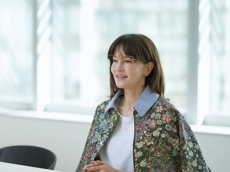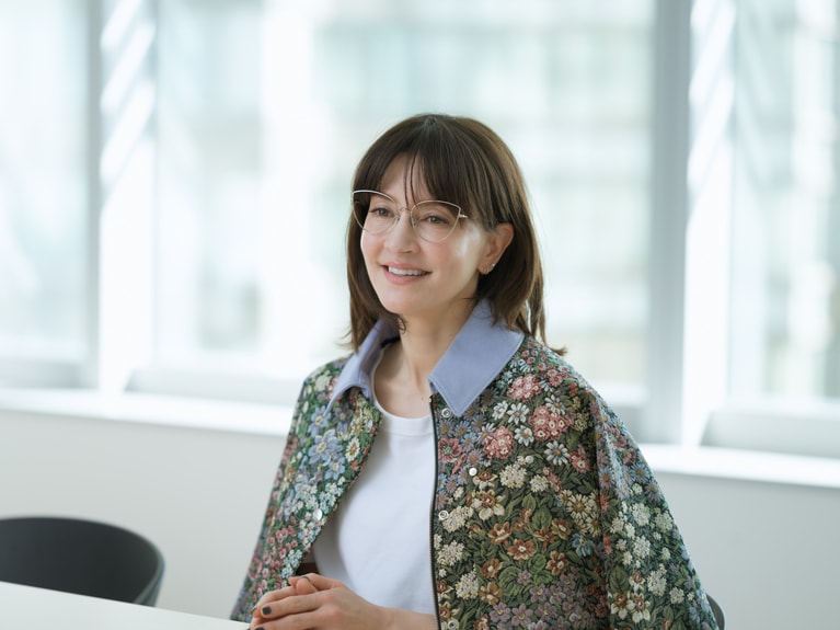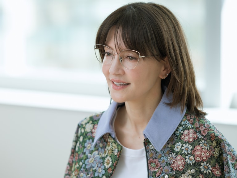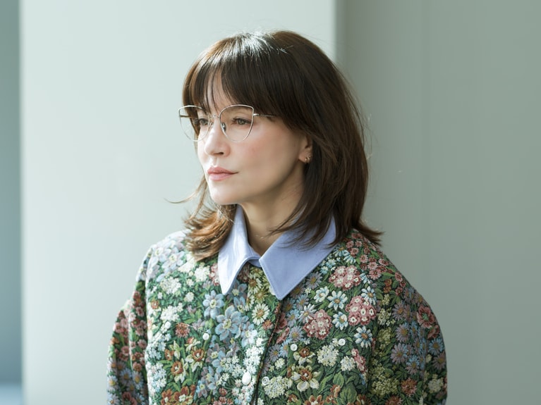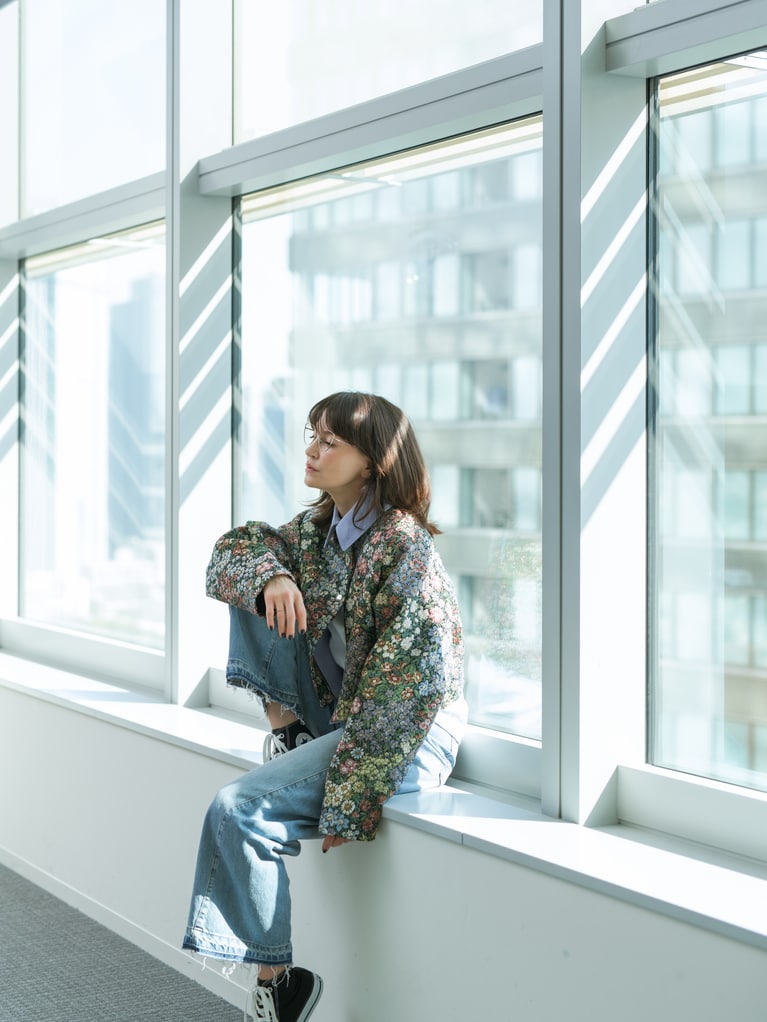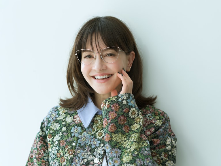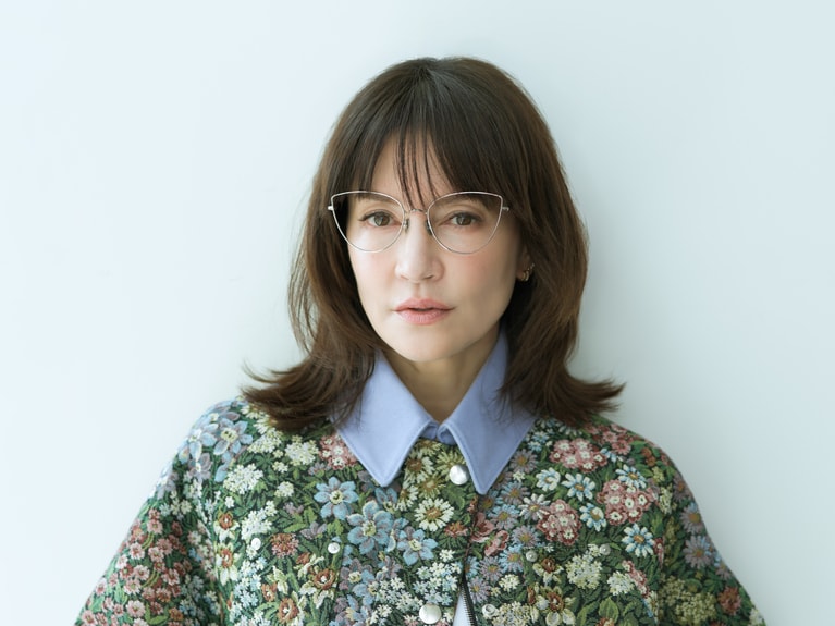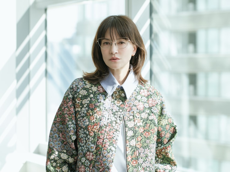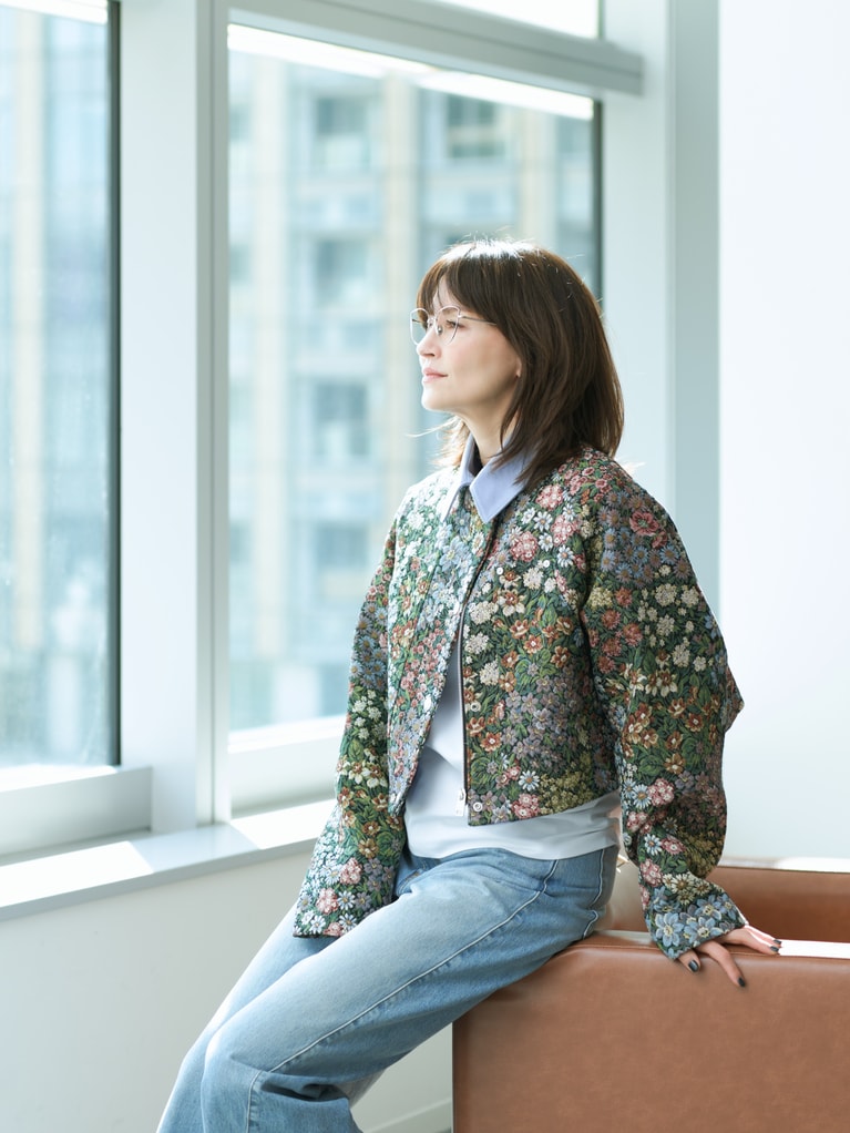 アンジェラ・アキさん ジャケット¥149,600、デニムパンツ¥75,900/ともにMSGM(エムエスジーエム) (アオイ http://aoi-net.jp)、ピアス左耳 上のパール¥36,600、左耳 下¥84,700/ともにヒロタカ 表参道ヒルズ、アイウエア¥83,600/アーレム (グローブスペックス エージェント)、ピアス右耳、靴、インナー/本人私物