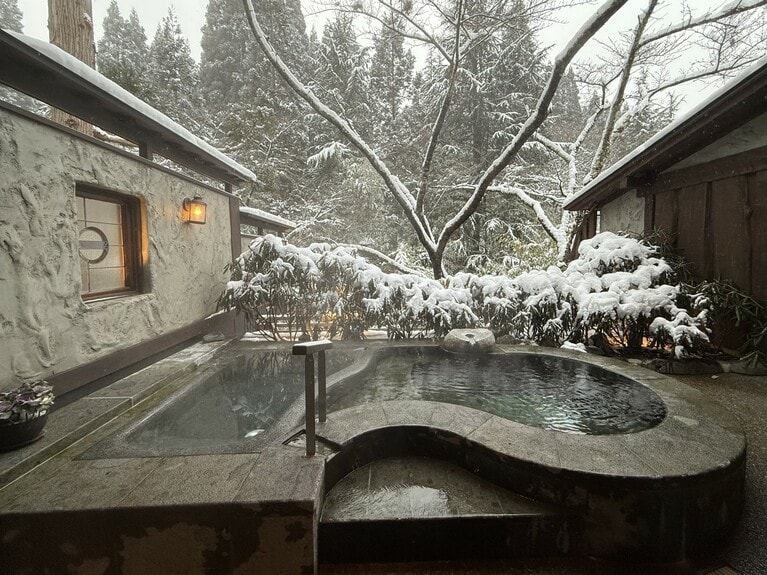 2024年に新設された「仙山亭」のゲスト専用の貸切風呂「原郷の湯」。 趣ある門を通って、宿の敷地へ誘われる。 ウエルカムは抹茶と甘酒の特別ドリンクと手づくりのお菓子。 風情ある庭を眺めて客室のテラスで外気浴。 片隅に書斎デスクがあるのもありがたい。 部屋のテーブルにはお茶請けになる地元のお菓子や畑の野菜のお漬物が。 天窓からの光が神秘的な湯船は、ボタンを押すと温泉ジェットバスになる。 夜の露天風呂で心もデトックス。 お風呂上りにテラスから眺める雪景色も最高。 湯あがりにみかんを食べてビタミン補給。 名物「岩窟 仙人風呂」は男女別大浴場の奥にある。 神殿みたいな雰囲気の洞窟温泉。 洞窟の奥から大量の源泉が自然湧出している。 敷地の小道に新設された焚き火を囲むテラス。 パチパチと燃える火を眺めると不思議と心が落ち着きます。 お造りはシナノユキマスの薄造り、ヤマメの炙り、なんと馬刺しの中にウニが巻いてあるものも。たっぷりの薬味や生姜と玉ねぎのソース、醤油、ポン酢などで食べ比べるのも楽しい。 リンゴの枝に刺して焼いた子持ち鮎の白焼きが登場。 料理長のスペシャリテは天然舞茸の天ぷら。 選べる肉料理が圧巻。 料亭には個室食事処の他に開放的なテラスの席がある。 ご飯にもパンにも合うおかずが充実。 朝からデザートとコーヒーでほっこり和む。