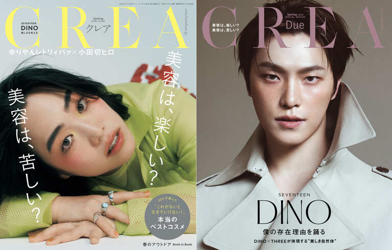 左から、通常版表紙(『CREA』2026年春号「美容は、楽しい? 美容は、苦しい?」/撮影:渡辺宏樹)とDINOが登場した特別版表紙(『CREA Due』2026年春号Special Edition/撮影:Yeongjun Kim) 「ゆりやんレトリィバァ×小田切ヒロ コンプレックスを、超えてゆけ!」企画より。撮影:渡辺宏樹 『CREA』2026年春号【特別版】インタビューより。DINOさん。撮影:Yeongjun Kim 「50人が選んだ『これがないと生きていけない!』本当のベストコスメ」企画より。撮影:植田翔 「FOUNDATION 自由な心で『粧(めか)す』ということ make-up:UDA」企画より。撮影:熊谷勇樹