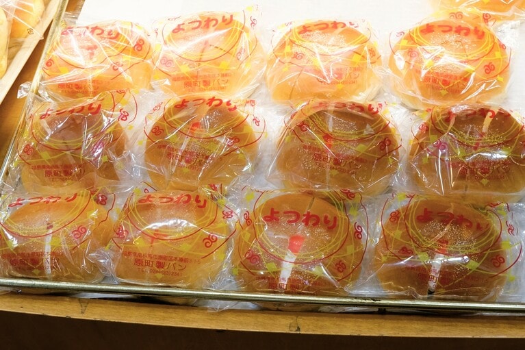 レトロなパン袋に入った「よつわりパン」155円。 2010年に同じ町内から現在の店舗に移転。三角屋根のメルヘンな建物が目印。 ケーキをイメージして生まれた「よつわりパン」155円。 フランスパンやデニッシュにも定評がある。 レトロな袋に入った昔ながらのパンが並ぶ。 震災後、一度も休むことなく店に並ぶ「よつわりパン」。 「原町製パン」は南相馬市の学校給食でもおなじみの存在。 左から、「コーヒーあんよつわり」180円と「よつわりパン」155円。 「南相馬市18歳巣立ち応援事業」のポスターに起用された佐藤さん夫妻。