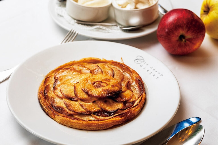 “りんごの薄く温かいタルト”14ユーロ。オーダーしてから焼くため早めに注文を。サクサクのパイ生地とキャラメリゼしたリンゴは甘さ控えめ。 “ブルゴーニュの大粒エスカルゴ”6個15ユーロ(夜は9個25ユーロ~)。ぷりぷりの身と、ニンニク、パセリ、バターのソースは王道の旨さ。 “舌平目のムニエル”62ユーロ(夜67ユーロ)。あっさりとした白身魚とブール・ブランソース、レモンのマリアージュが至高。 フランス国立図書館所有となり、1985年に大規模修復。往時の輝きを取り戻した。常連客は近隣で働くビジネスマン多い。