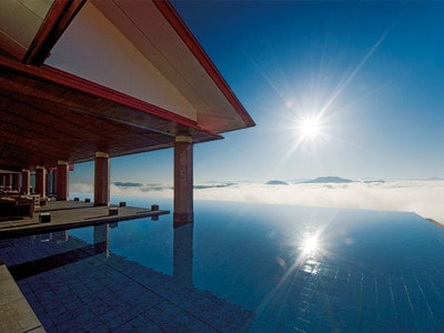 雲の上からの眺め、見渡す限りの青い海、夜空を彩る流れ星のシャワー……。自然と一体化した温泉だからこそ楽しめる絶景がある。早朝や夕暮れといった時間で変わる表情も逃さずに。