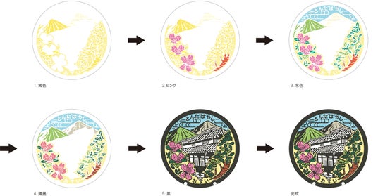 「富田林寺内町燈路」を巡りながら、重ね捺しスタンプで一つ一つ色を重ねると(5カ所)、色鮮やかで風情漂う富田林市のマンホール蓋のデザインが完成します。