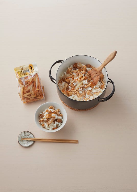 5種類の国産きのこ・野菜を使用した炊き込みご飯の素。ふわっと香るだしが効いた季節限定商品です。