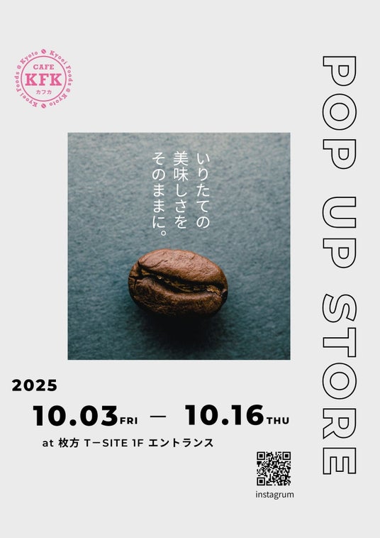京都でコーヒーの焙煎をし続けて半世紀以上になる共栄フーズ株式会社(本社:京都府久世郡久御山町、取締役社長 伊藤真二)が展開する、高品質なコーヒーのみを取り扱うコーヒーブランドCAFE KFKのPOP UP STOREを2025年10月3日(金)~10月16日(木)の期間で枚方T-SITE 1F イベントスペースにて開催!期間中はスペシャルティーコーヒーの試飲も実施。コーヒーを愛する皆さまのご来場を心よりお待ちしています。