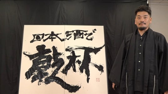 また、臼井さんによる揮毫パフォーマンスでは、「日本酒で乾杯」の文字がダイナミックに書き上げられ、力強い筆致と音楽が一体となった演出によって、配信の場が一瞬にして静謐かつ熱気を帯びた空間へと変貌。書と日本酒の融合が織りなす新たな体験に、多くの視聴者が魅了されました。