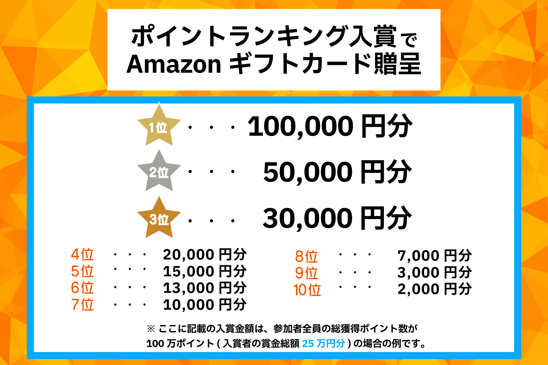 入賞者の総額賞金は最大25万円分。入賞者のアマギフ賞金総額は、みんなの総獲得ポイント数に応じてアップしていく仕組みです。みんなの総獲得ポイント数が100万ポイントの場合、入賞者のアマギフ総額は25万円分となり、1位の方には10万円分、2位の方には5万円分、3位の方には3万円分、... の Amazon eギフトカードが贈呈されます。投稿をすればするほど、新規ユーザーを紹介すればするほど、参加者の皆様にとって大きなメリットがあります。