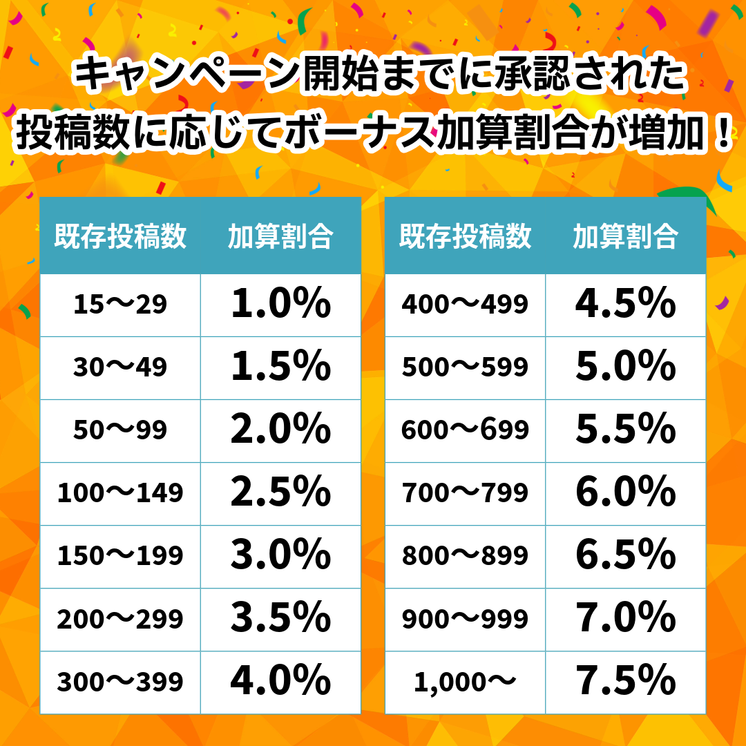 キャンペーン開始までに承認された投稿数に応じて、ボーナス加算%が増加します。