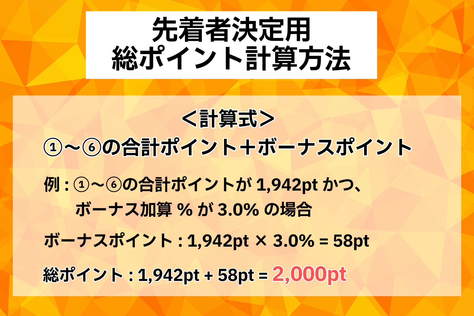 1.~6.の合計ポイントが1,942pt かつ、ボーナス加算%が3.0%の場合、ボーナスポイントが1,942×3.0%=58pt で、最終的な先着決定用総ポイントは、1,942+58=2,000pt になります。