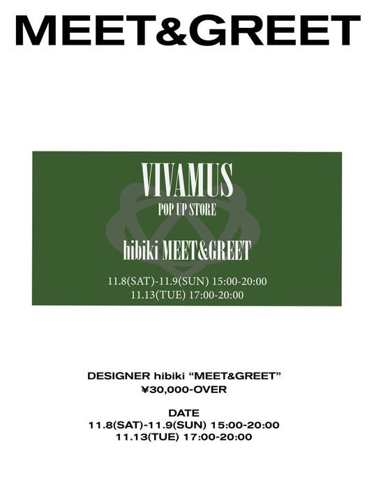 POP UP開催を記念して、「VIVAMUS」の商品を税込¥30,000以上お買い上げいただいたお客様は、以下の日程でディレクター「hibiki」と写真撮影できる特典もご用意しております。
