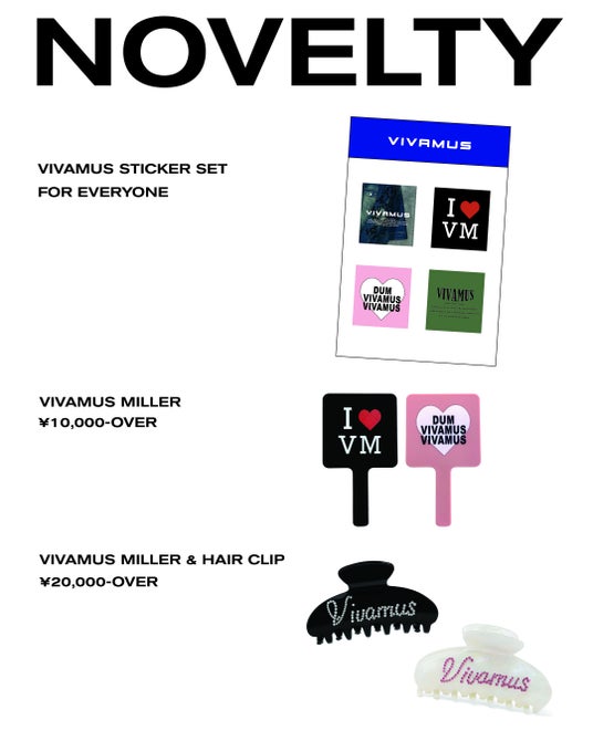 さらに、「VIVAMUS」の商品を税込¥10,000以上お買い上げいただいたお客様には「VIVAMUS MILLER」、税込¥20,000以上お買い上げいただいたお客様には「VIVAMUS MILLER」+「HAIR CLIP」をプレゼントいたします。