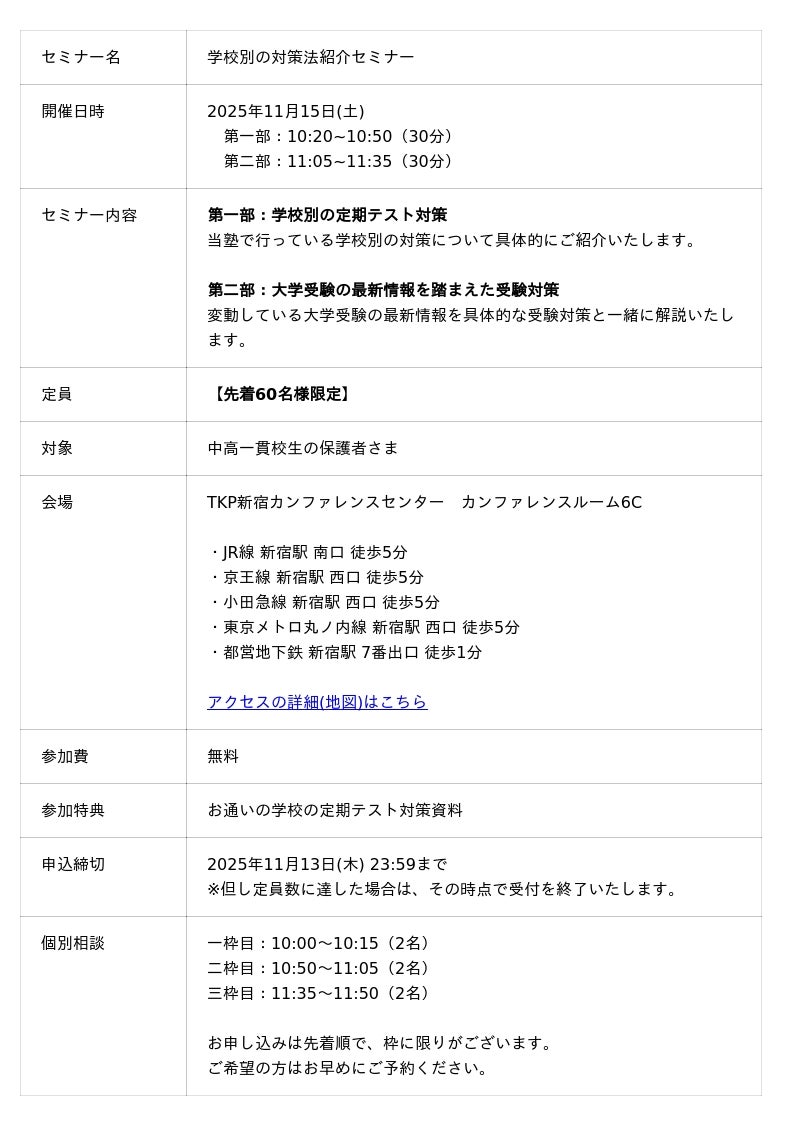 中高一貫校生に向けた「学校別の対策法紹介セミナー」を11月15日(土)に開催
