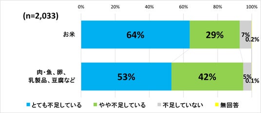 全体の約95%の家庭で、米や肉・魚などのタンパク質を十分に摂ることができていません。お腹にたまるはずの米飯も、貴重なたんぱく源だった卵も、それぞれ価格高騰により手を出すことができず、お腹も栄養も満たすことができていません。