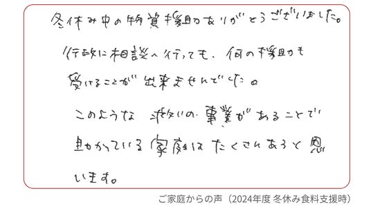 新入学を控える学年の子どもがいるご家庭からは特に「入試の受験料など多くの出費が控えている中で支えになった」「学用品を買うのに困っていたので、浮いた費用を充てられて助かった」といった声もいただいているように、このタイミングでの出費が子どもたちの将来にも大きく影響することが分かります。