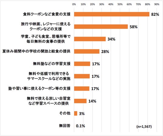 長期休みには8割以上の家庭が、食料の支援を必要としています。一日の栄養の要である給食が無くなることの影響が顕著に表れています。続いて58%の家庭で、体験機会が求められています。
