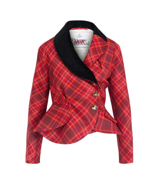 コンテンポラリーに進化させたアーカイブスタイルにフィーチャーしたピース--ライトピンクのポプリンで仕立てた「Mini Sunday Dress」は、ヴィヴィアン・ウエストウッドのシグネチャータータンを繊細に重ね刷りし、大胆なレッドのロキャロンタータンで仕上げたストーミージャケットは、ブラックベルベットのコントラストラペル、アシンメトリーなフロント、エナメルのオーブボタンをあしらいました-1996/97年秋冬「Storm In A Teacup」に登場したストーム・ジャケットへ捧げるオマージュでもあります。