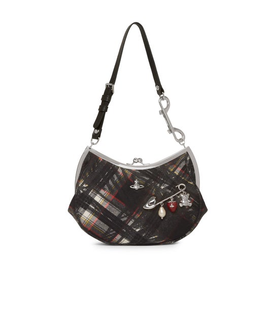 コーラルピンクのクロケジャカードで仕立てたハートモチーフの「Belle Frame Purse」、ブラックのスクリブルタータンまたはレッド×グリーンのタータンで登場する「Charm Frame Purse」は、主人公ふたりの対照的な美学を映し出します。どのスタイルにも、NANAを象徴するセーフティピンにドロップパール、テディ、ストロベリーモチーフのディテールを配しました。