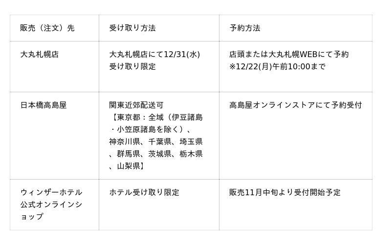 本商品は株式会社大丸松坂屋百貨店(大丸札幌店舗にて受け取り) および 日本橋高島屋(関東近郊配送可)にてご予約受付中。さらに11月よりウィンザーホテル公式オンラインショップにて、ホテル受け取り限定販売も開始いたしました。