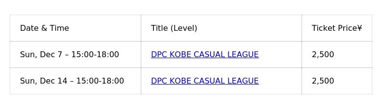 Press Release Overview | DPC KOBE CASUAL LEAGUE - Open to All Beginners This December!