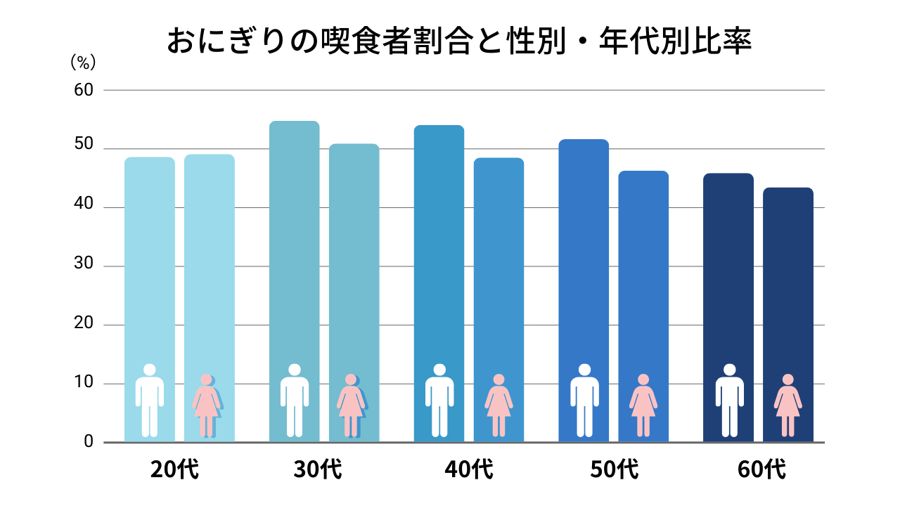おにぎり喫食者は全体の約48%(ほぼ半数)であり、多くの利用者の食生活におにぎりが日常的に取り入れられていました。性別×年代別の喫食率では、男性の喫食率が女性よりわずかに高く、男女ともに30代の喫食率が最も高い割合となりました。30代は生活が忙しい時期であり、手軽に食べられる主食としておにぎりが選ばれている可能性があります。