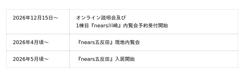 新規入居者の募集に先立ち、12月15日から、オンライン説明会ならびに、1棟目『nears川崎』での内覧会の予約受付を開始します。内覧会へのご参加希望やその他質問は、以下URLからお問合せください。