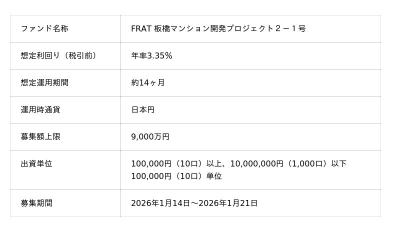 「未来をわかちあう投資」を提供する「Funvest(ファンベスト)」(以下、Funvest)は、「FRAT 板橋マンション開発プロジェクト2-1号」(以下、本ファンド)の募集を1/14より開始しますので、お知らせいたします。