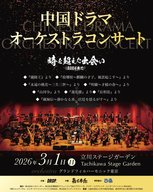 中国・アジアエンターテイメントの日本展開を行う株式会社ドロップは、人気の中国ドラマの劇中歌(OST|Original Sound Track)をフルオーケストラ演奏で楽しむことができるイベント『中国ドラマオーケストラコンサート~時を超えた出会い 2026・奏で~』を、2026年3月1日(日)に東京・立川の立川ステージガーデン(東京都立川市緑町3-3 N1)で開催します。複数の中国ドラマのOSTをオーケストラアレンジしたコンサートの開催は日本初の試みとなります。