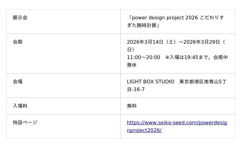 セイコーウオッチ株式会社(代表取締役会長 兼 CEO 兼 CCO:服部 真二、本社:東京都中央区)は、腕時計の新たな可能性を育み、腕時計の様々な楽しさを体験できる活動「Seiko Seed(セイコーシード)」の一環として、「power design project 2026 こだわりすぎた腕時計展」を2026年3月14日(土)から3月29日(日)までの期間、港区南青山にあるライトボックススタジオで開催します。