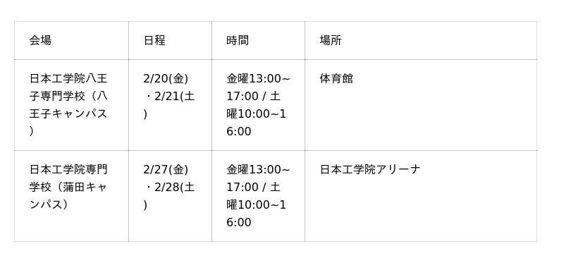 ・来場者参加型イベント: 2月28日(土・蒲田)には、一般来場者が学生の技術を直接体験できる「体験Day」を実施。