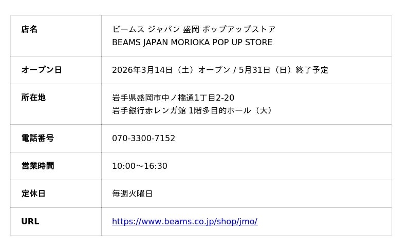 ビームス ジャパン 盛岡 ポップアップストア 3月14日(土)~5月31日(日)(期間限定)