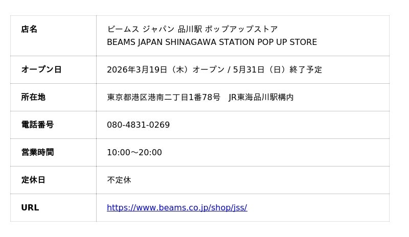ビームス ジャパン 品川駅 ポップアップストア 3月19日(木)~5月31日(日)(期間限定)