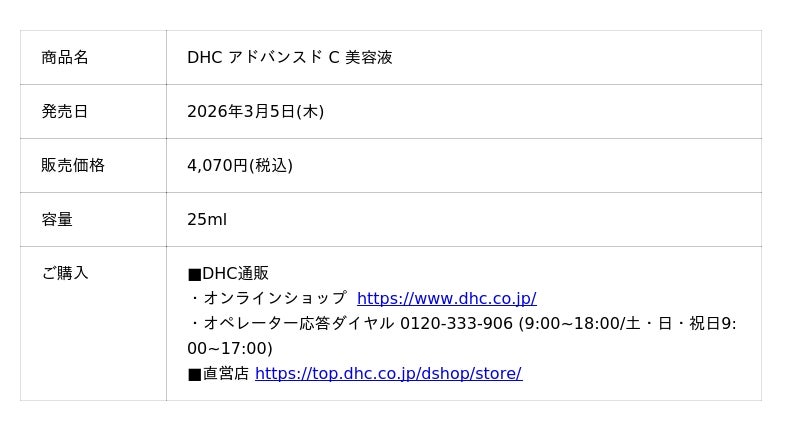 株式会社ディーエイチシー(本社:東京都港区、代表取締役社長:宮崎 緑、以下:DHC)は、肌全体の透明感を損なう“にごり印象”やキメの乱れに着目して開発した美容液「DHC アドバンスド C 美容液」を2026年3月5日(木)より新発売いたします。