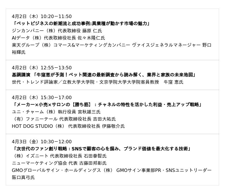 本見本市では、ペット業界の最新情報や実務に直結する知見を提供するビジネスフォーラムや各種ステージプログラムも併催します。特設ステージでは、基調講演として世代・トレンド評論家の牛窪恵氏が登壇。最新の市場調査をもとにペット業界と日本の家族の未来を予測、ビジネス来場者に明日へのビジネスヒントを提示します。ビジネスフォーラムでは、異業種の成功事例、売上・利益向上、次世代のファン創出をテーマに、業界内外から登壇者を招き、多角的な視点で情報を発信します。さらに、動物医療分野での功績が評価された一般社団法人日本愛玩動物看護師会(JVNA)会長・横田淳子氏が「インターペットアワード」を受賞し、表彰式と特別講演を行います。他にも、現役サロングルーマーが技術を競う「ハッピーグルーミングコンテスト」を開催。多様な企画を通じて、学びと体験の機会を創出し、市場拡大と新たなビジネス創出を促進します。