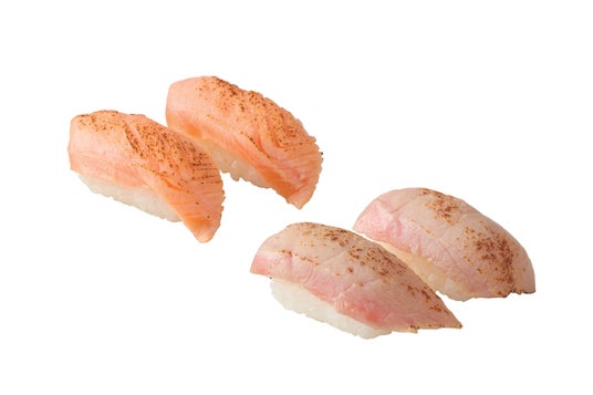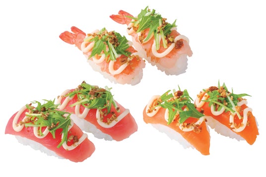 新たに「炙り寿司」と「ザクザク醤油寿司」が仲間入り。「炙り寿司」はまぐろ・サーモンの2種をご用意しており、ネタの旨味と香ばしさを楽しめる一品に。「ザクザク醤油寿司」はサクサクとした食感とスパイシーな味が特徴のしょうゆフレークに、マヨネーズ、水菜をトッピング!サラダ感覚でさっぱりとお召し上がりいただけるお寿司です。