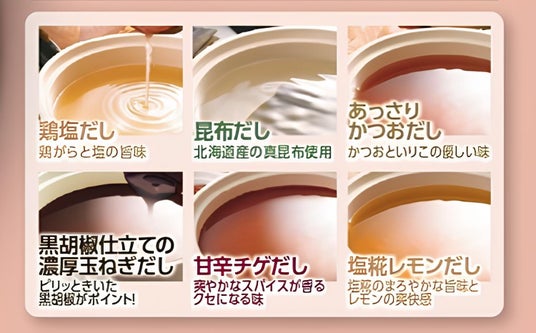 今回は新しく「黒胡椒仕立ての濃厚玉ねぎだし」「甘辛チゲだし」「塩糀レモンだし」の3種類が登場!春夏に楽しむのにぴったりなラインナップとなりました。ぜひこの機会にお試しください。