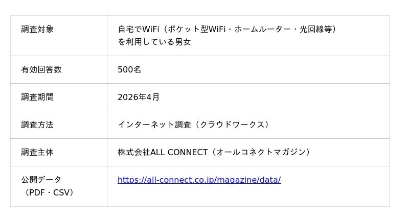 通信インフラ事業と地域振興事業を手掛ける株式会社ALL CONNECT(代表取締役社長:岩井宏太・本社:福井県福井市)が運営する通信メディア「オールコネクトマガジン(https://all-connect.co.jp/magazine/)」は、自宅WiFi利用者500人を対象に、WiFiの選び方・満足度・後悔に関する調査を行いました。