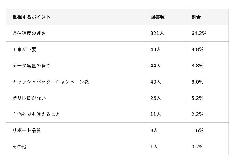 ・2位以下は10%未満で、速度へのニーズが突出している