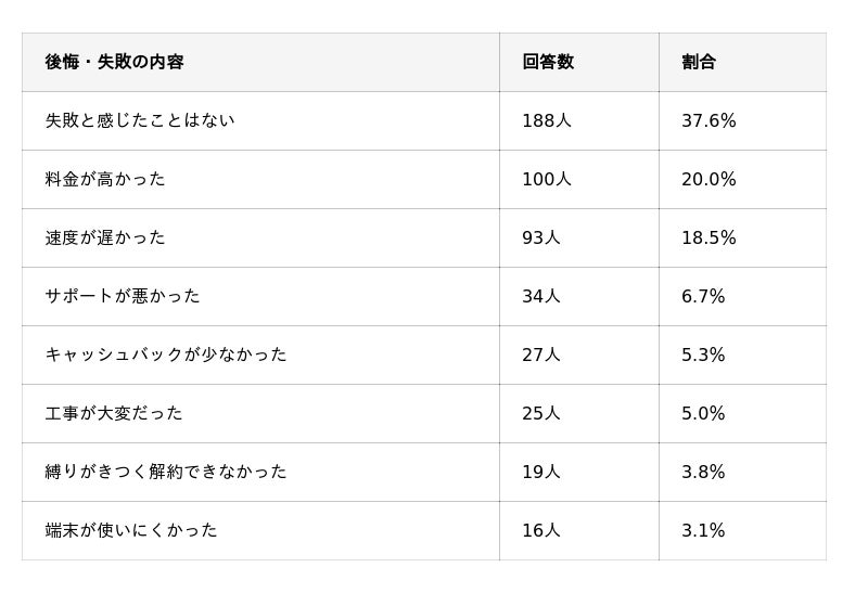 後悔理由を見ると、「料金が高かった」(20.0%)と「速度が遅かった」(18.5%)がほぼ同率でトップ2を占めています。