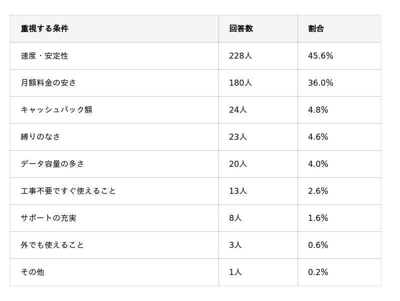 後悔理由のアンケート結果でも「料金が高かった」「速度が遅かった」がトップ2だったことと一致しており、過去の後悔を踏まえて「次は速度と料金のバランスで選びたい」という意識がはっきりと表れています。