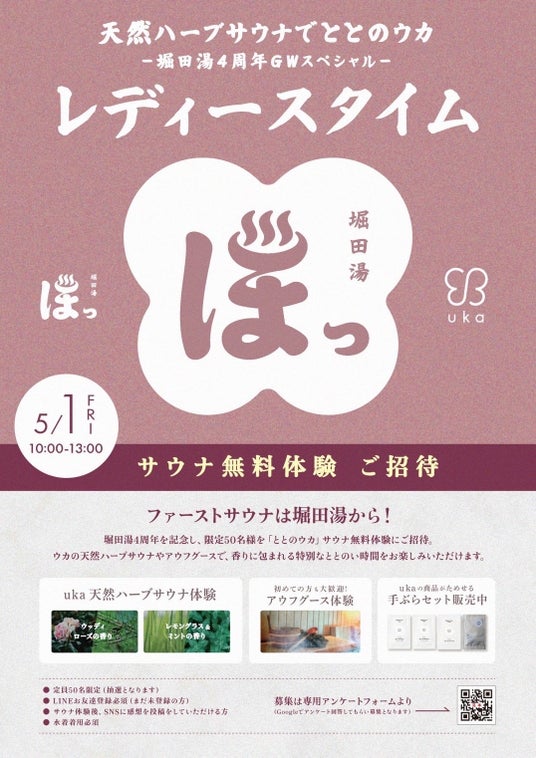 この度、トータルビューティーカンパニー uka(@instauka, @ukacojp, @ukabeauty.co)は、株式会社ピクセル(本社:東京都、代表取締役:堀田和宣)が運営支援する老舗銭湯 「堀田湯」(@ hottayu_nishiarai)とコラボレーションした特別イベント「天然ハーブサウナでととのウカ ~堀田湯4周年 GWスペシャル ~」を、2026年5月1日(金)~5月6日(水)のゴールデンウィーク期間限定で開催いたします。